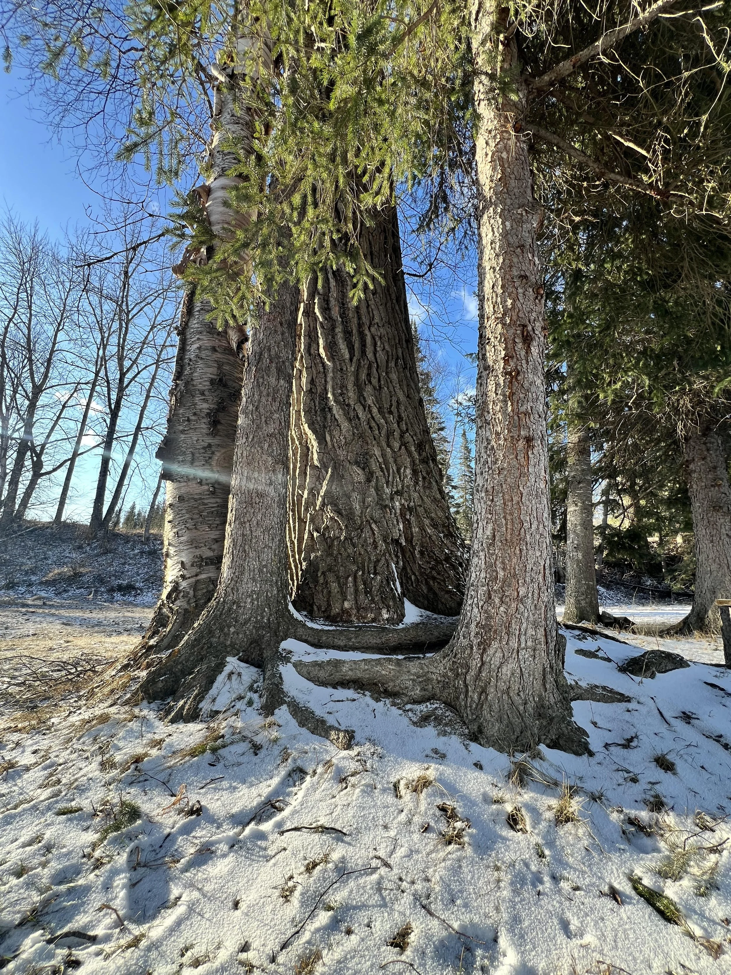 Along the Fraser River, there stands the largest cottonwood tree on my homestead property. It doesn’t stand alone, but is a large focal point within a cluster of 5 trees. The large cottonwood, a smaller birch and 4 spruce. All together they form a portal location which merged into my awareness last year in 2025.